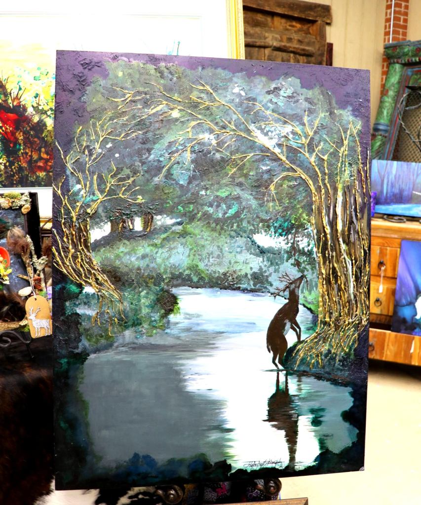 An Acrylic and Alcohol Ink painting 36″ by 36″, 2″ deep on Museum Gesso Board with painted deer, moss, and glitter ready to install.