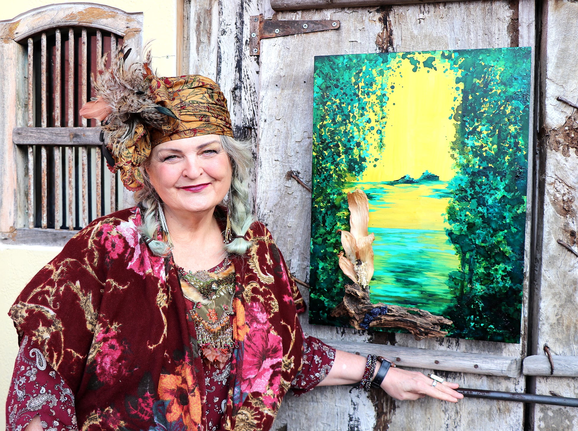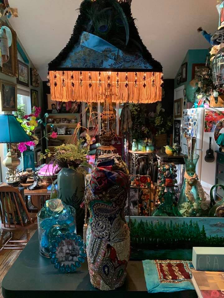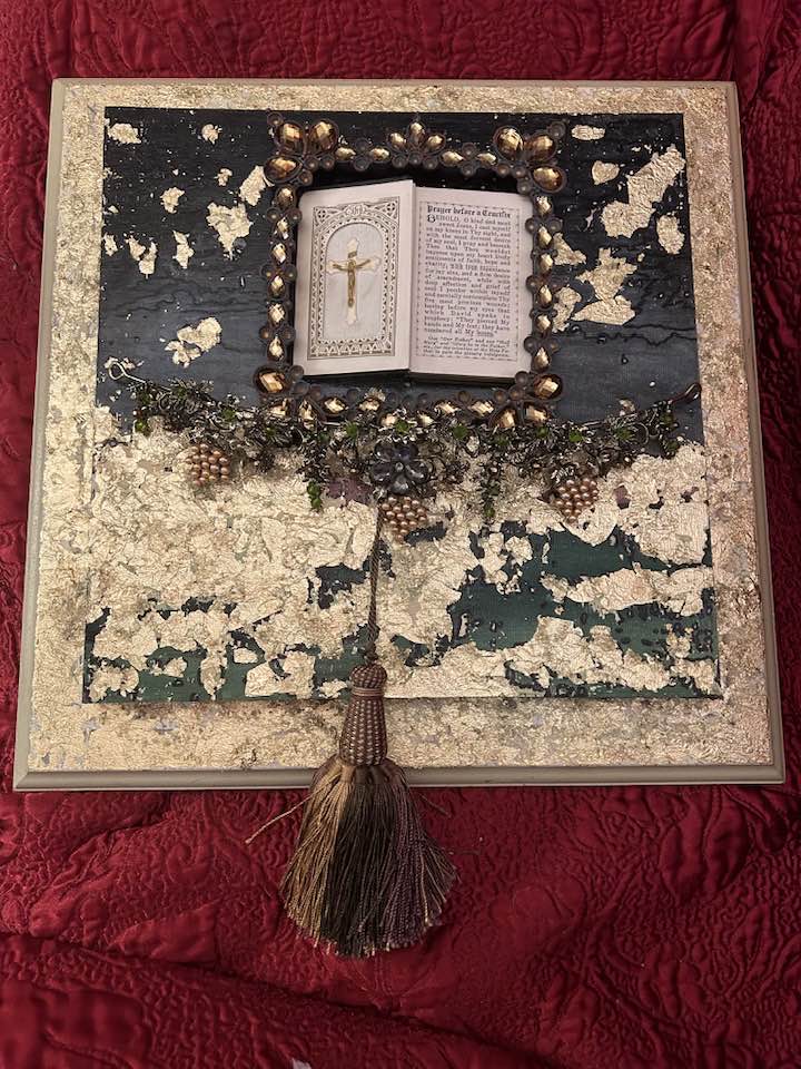 An Acrylic and Alcohol Ink painting on vintage wooden frame with board, 17″ by 25″ with vintage beaded India sari fabric, , vintage jewelry, shells, miniature book and assorted glass beads, pearls, and feathers.