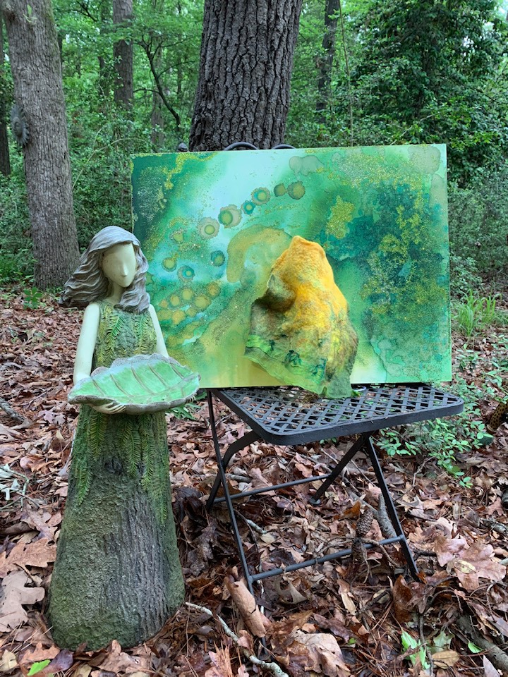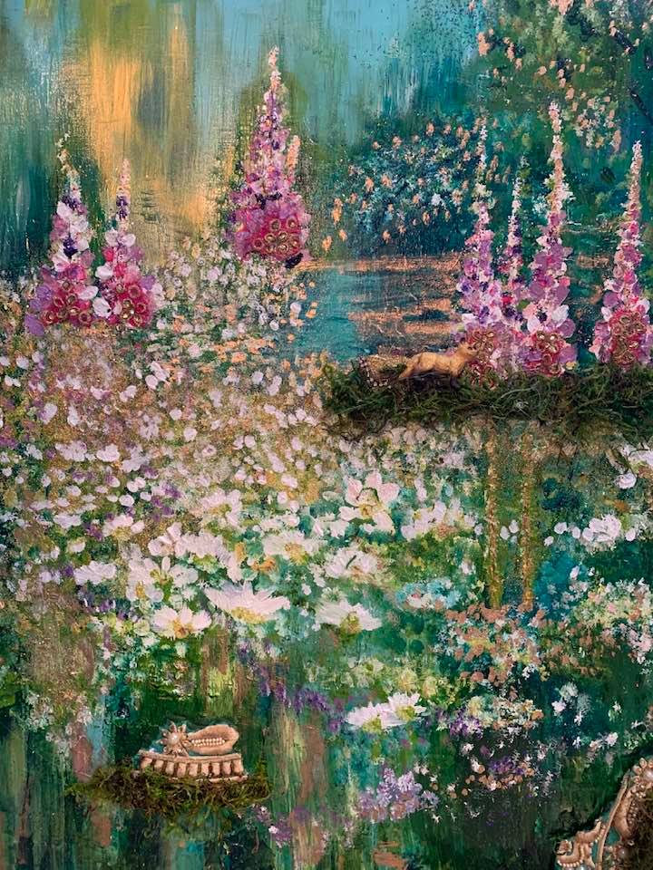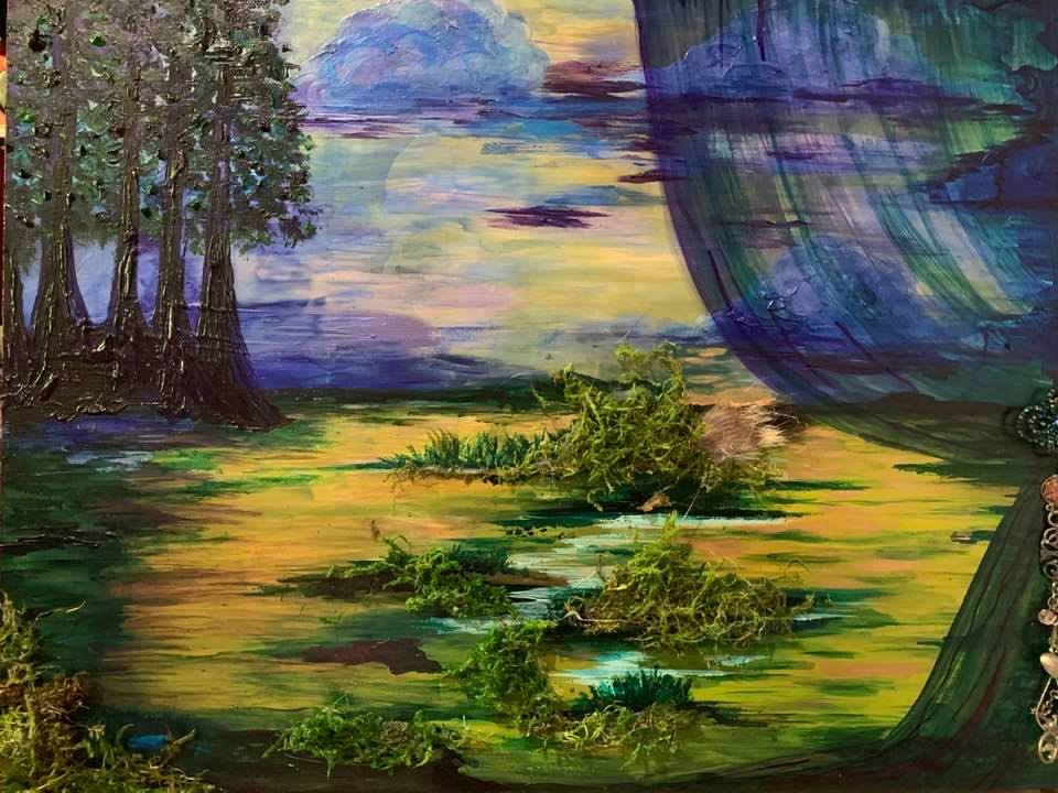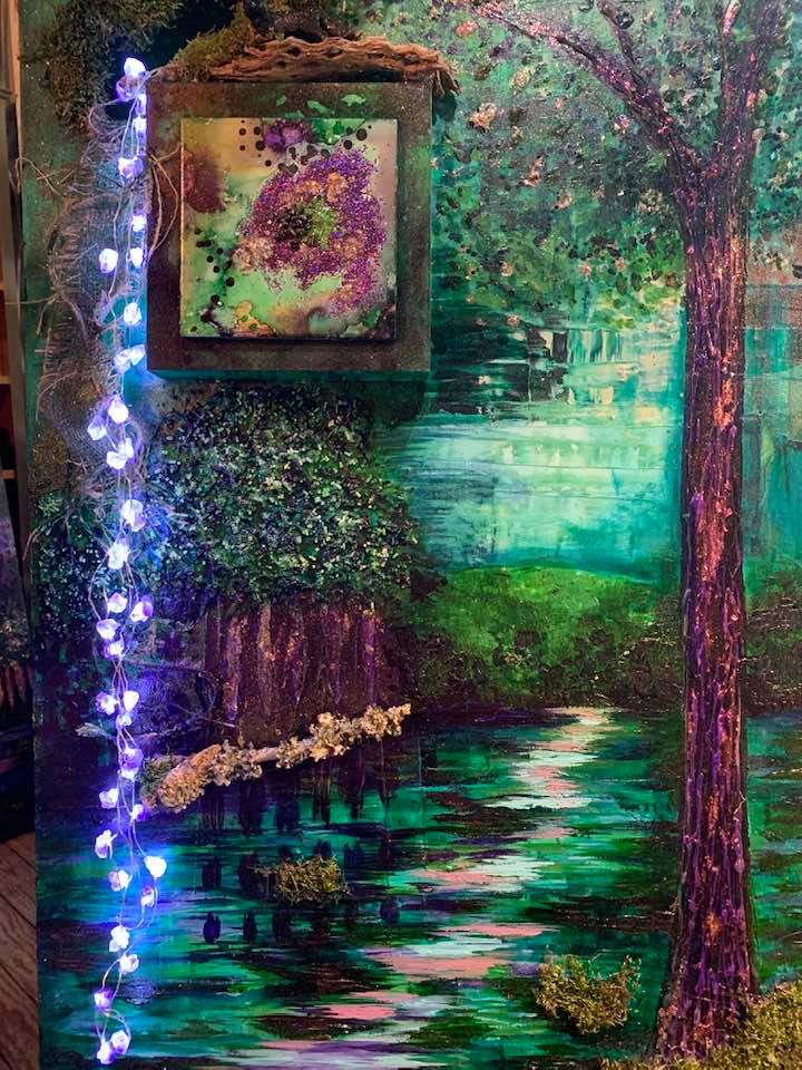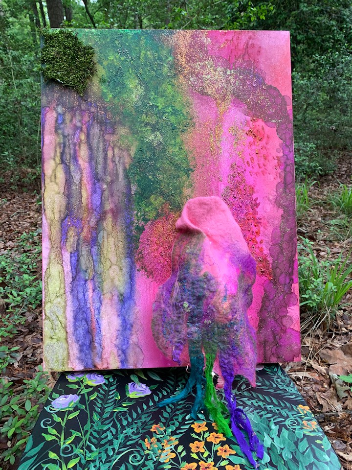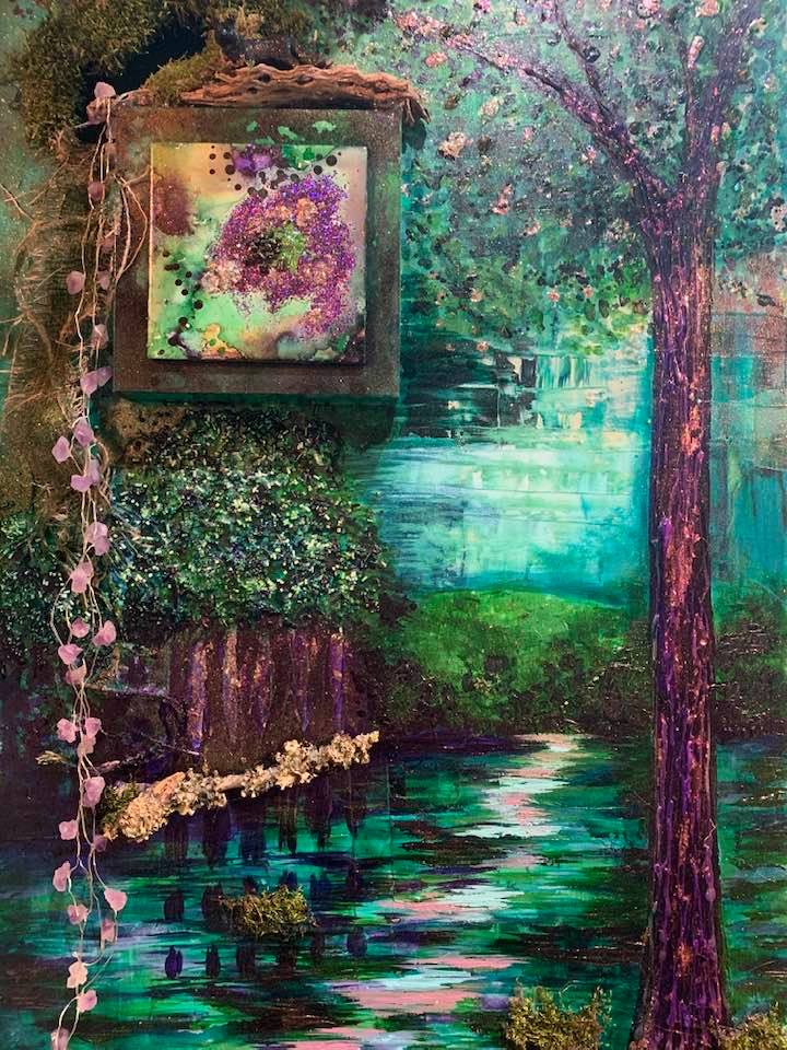 Acrylic and Alcohol Ink Painting, 24″ by 18″ on Museum Gesso Board with moss, fur, and vintage jewelry ready to install.