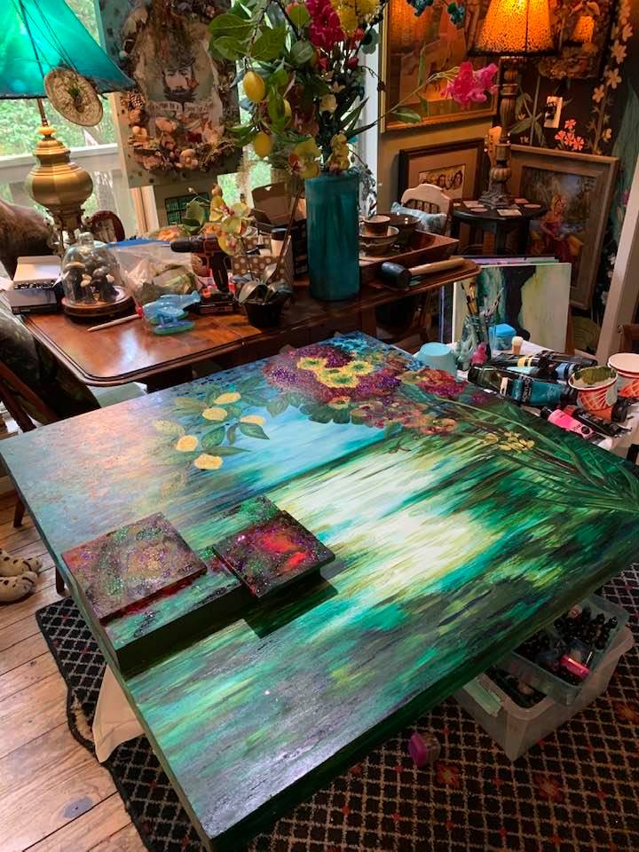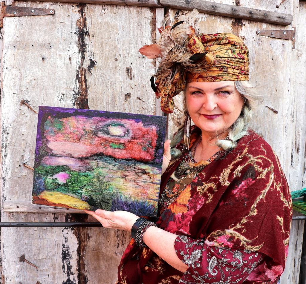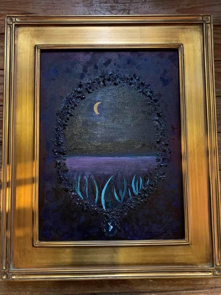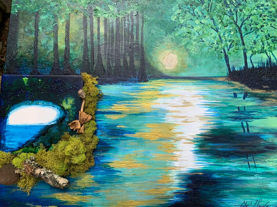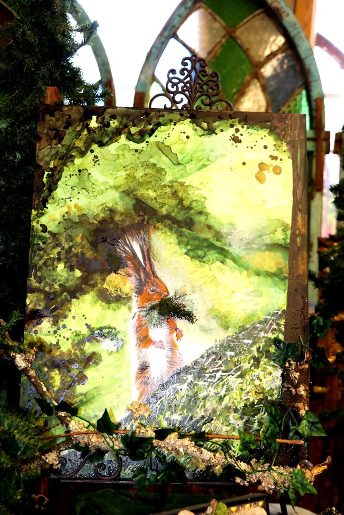 Acrylic and Alcohol Ink Painting, 24″ by 18″ on Museum Gesso Board with moss, fur, and vintage jewelry ready to install.