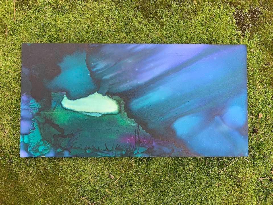 An Alcohol Ink and Acrylic painting on pressed board ready to install.