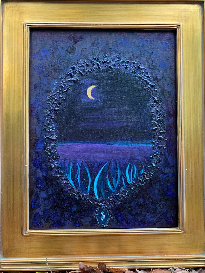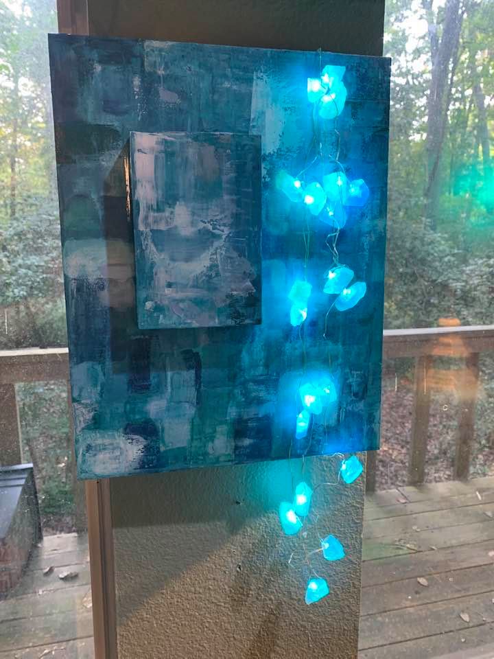 Acrylic painting on textured gesso board, 11″ by 14″ with attached Fluorite lights with remote control, ready to install.