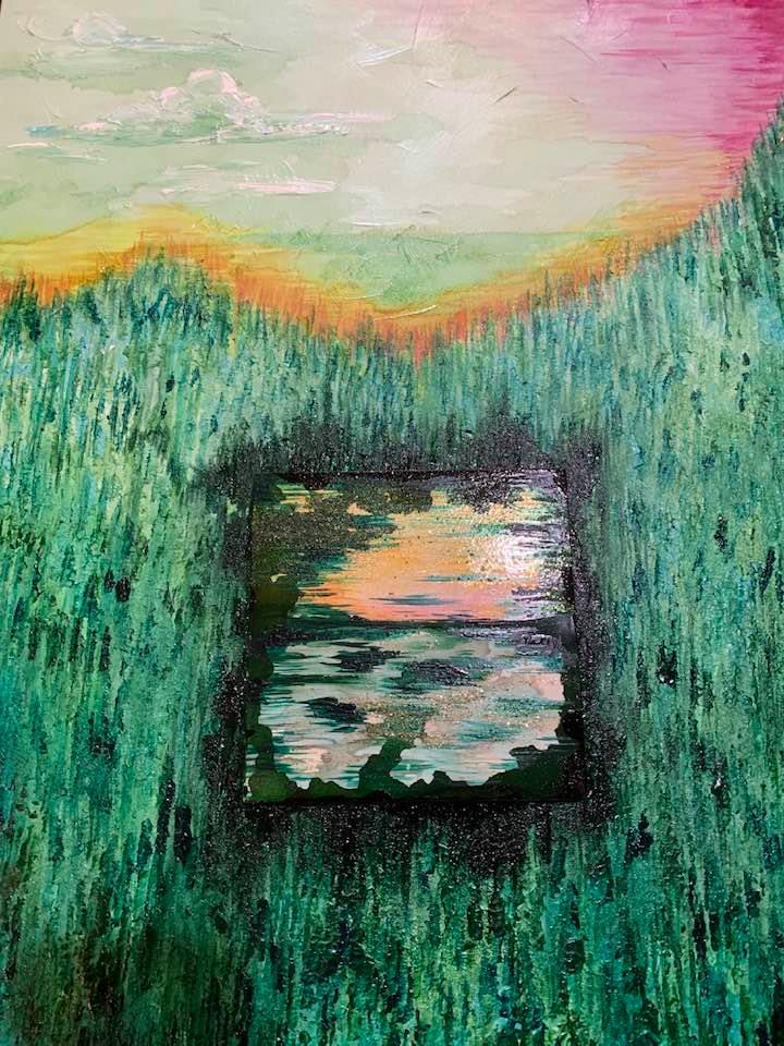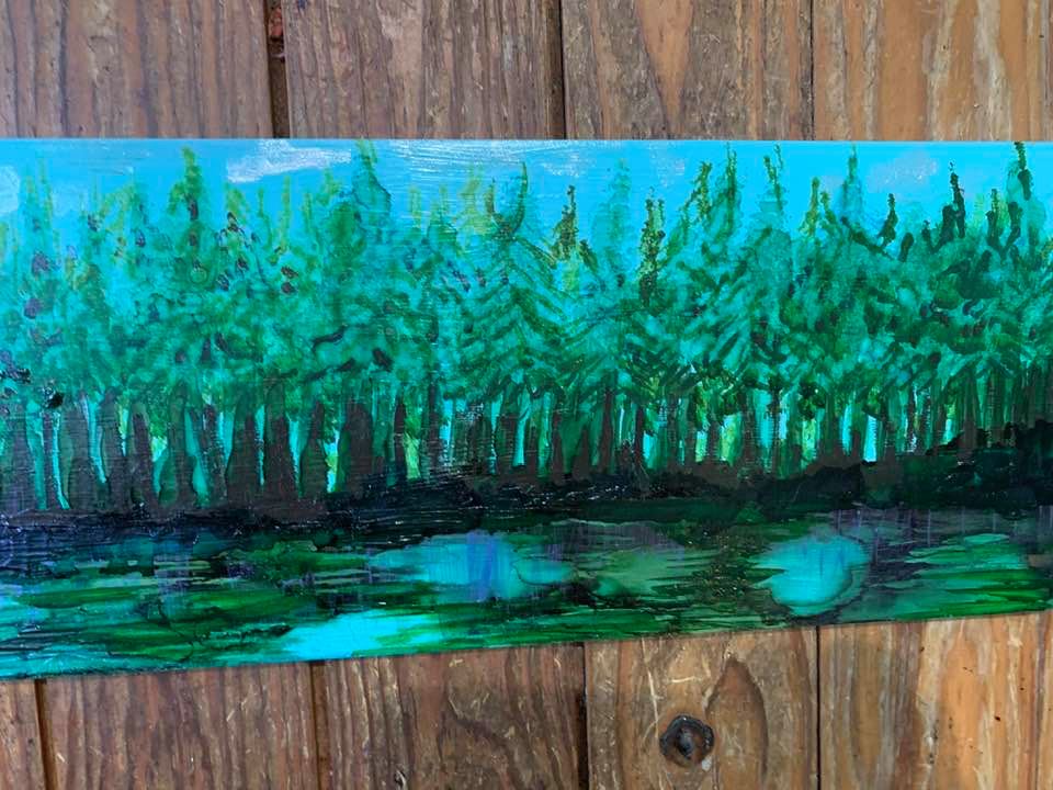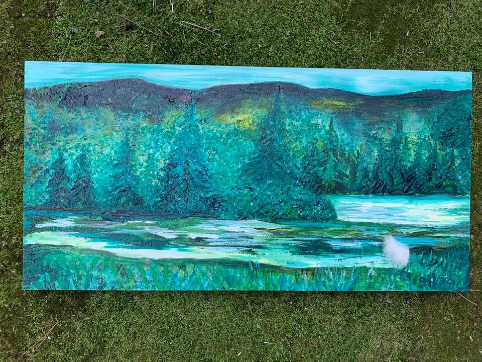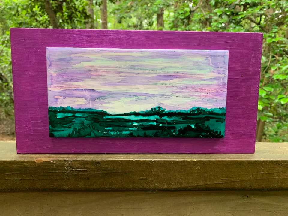 Alcohol and Acrylic painting with wired moss on 18″ by 24″, 1 3/4″ deep Museum Gesso Board ready to install.