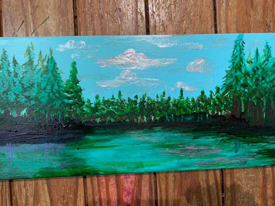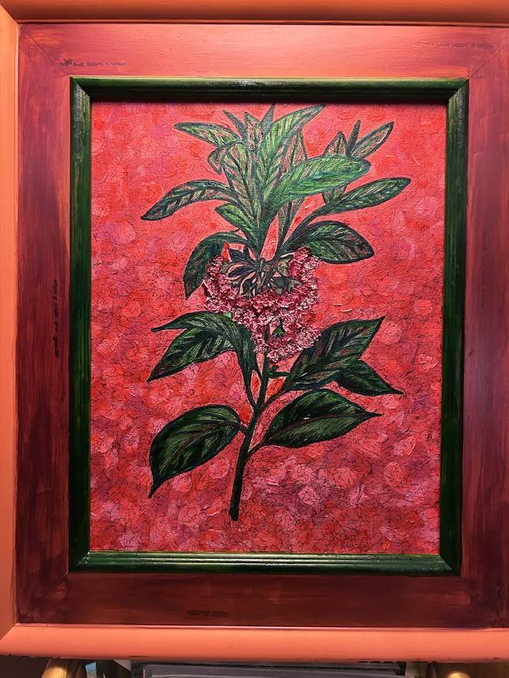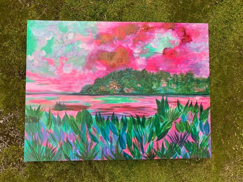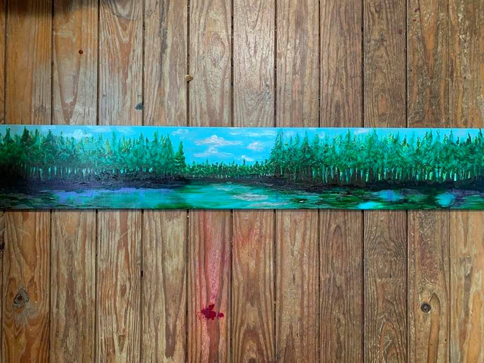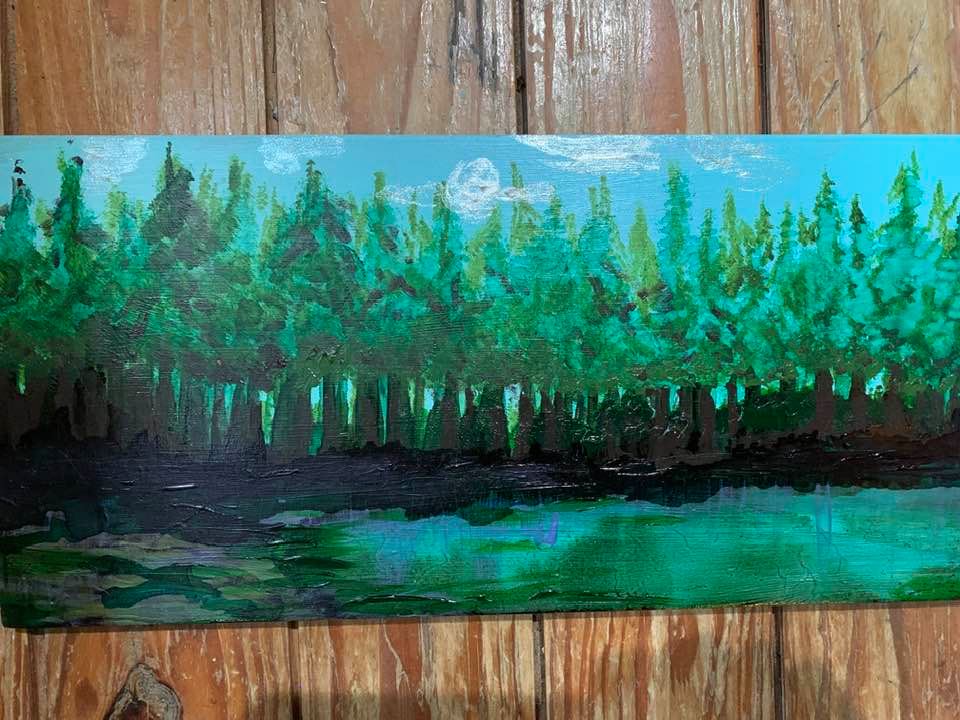 Alcohol and Acrylic painting with wired moss on 18″ by 24″, 1 3/4″ deep Museum Gesso Board ready to install.
