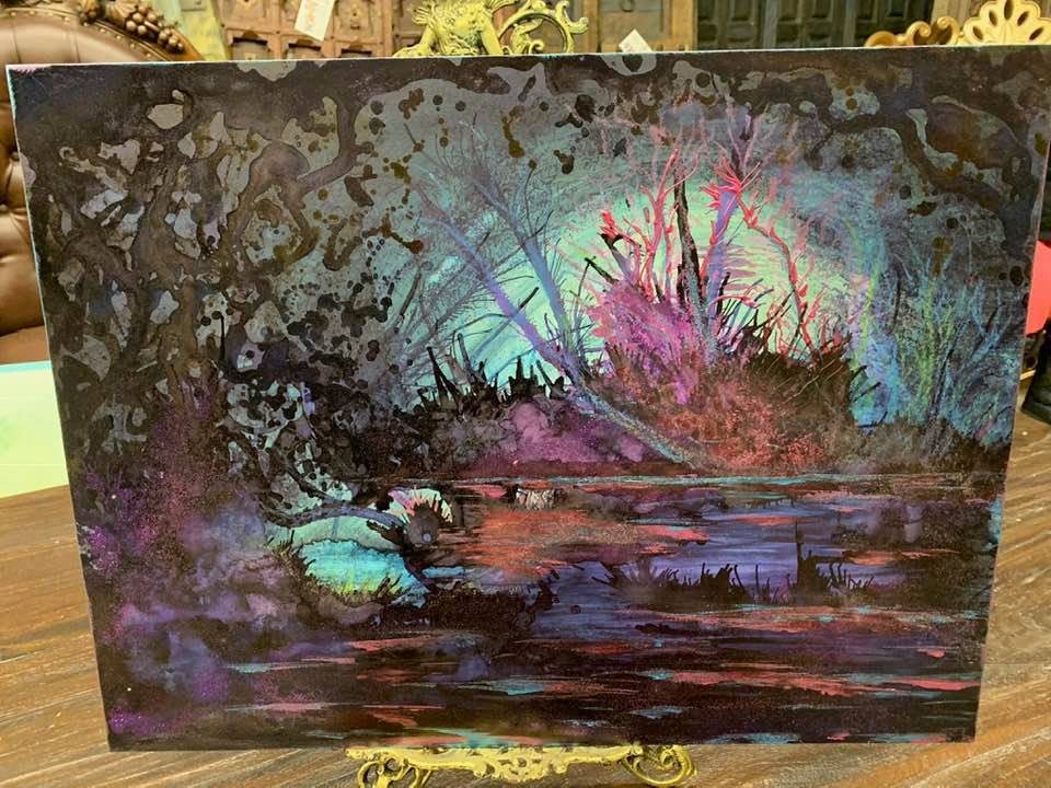 Alcohol Ink and Acrylic painting on canvas board in custom repurposed frame, 16 1/2″ by 19 1/2″.