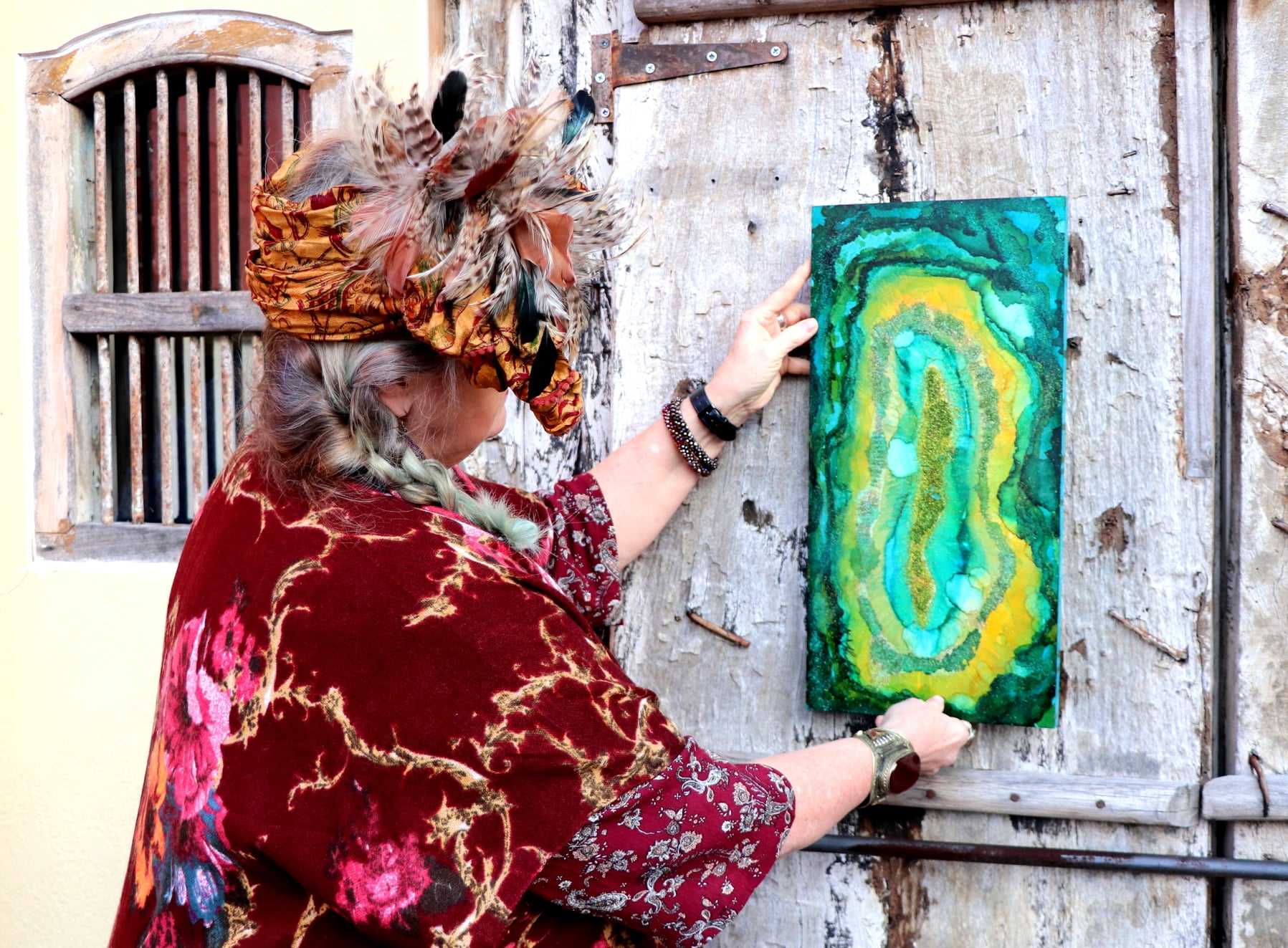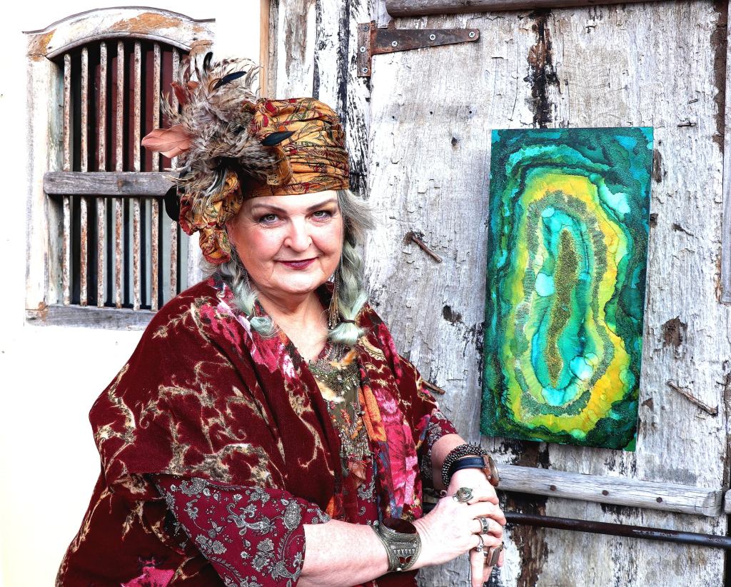 On your right, “Mama Mia”, Alcohol Ink Painting on 24″ by 18″ Museum Gesso Board