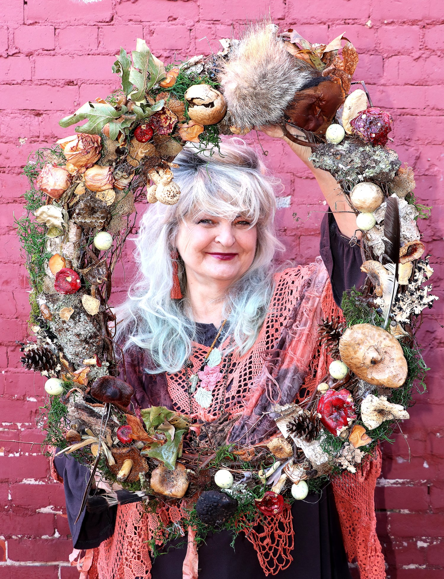 These a grapevine wreath that has all my forest finds that have been dried and preserved attached to create a wreath of the best of the flora and fauna of my East Texas woods.