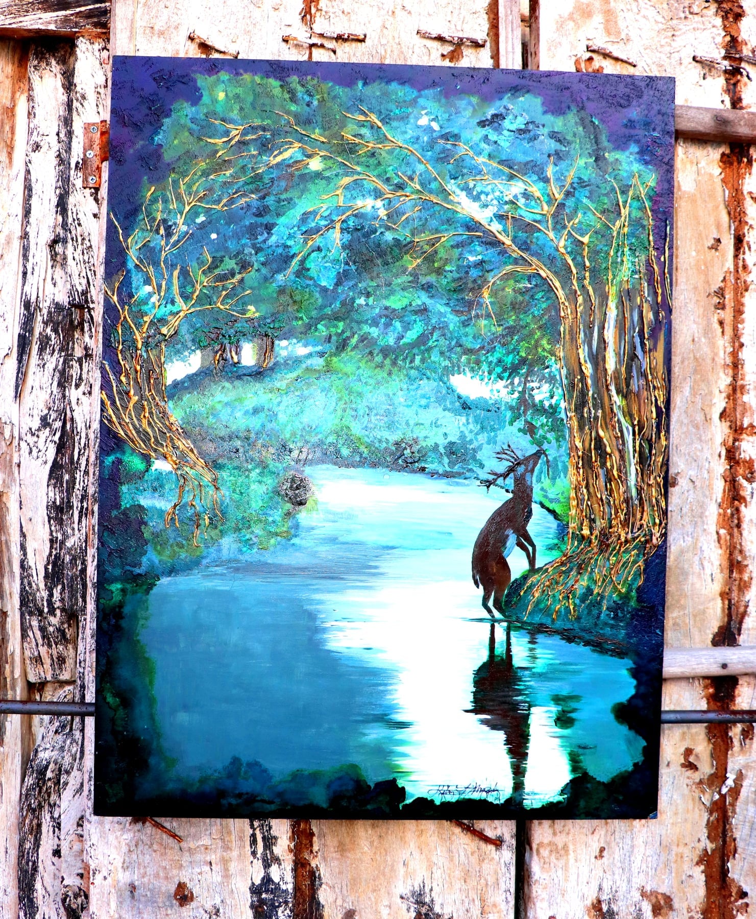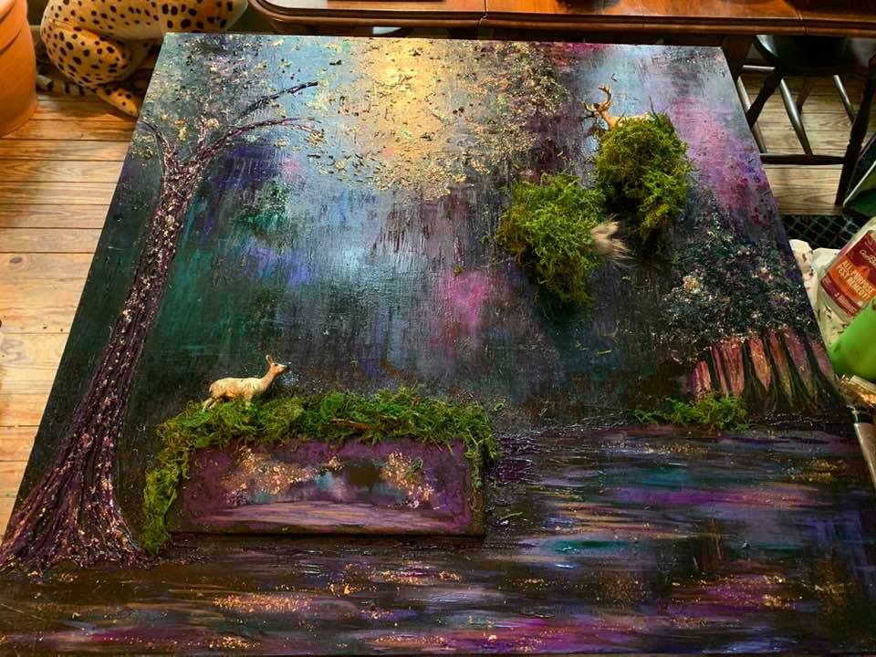 Acrylic and Alcohol Ink painting, 36” by 36”, 2” deep on Museum Gesso Board with painted deer, moss, and glitter