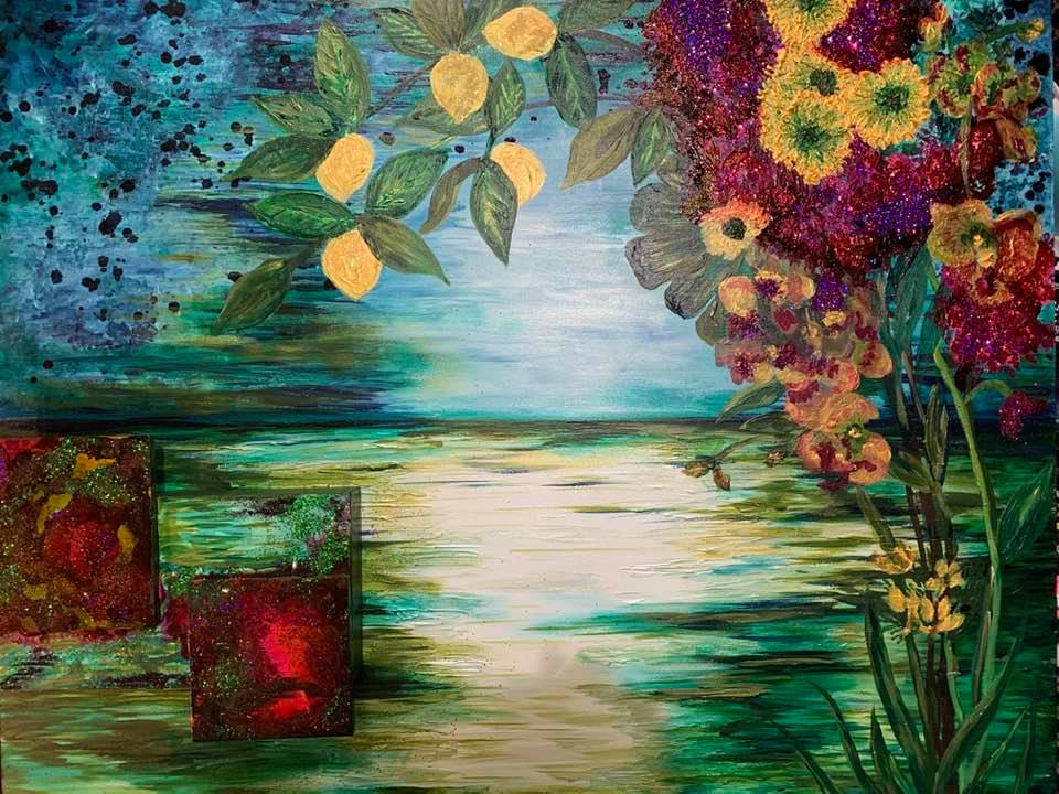 Includes three paintings: Top left: “Island Hopping”, Alcohol Ink Painting on 16″ by 12″ Museum Gesso Board Bottom left: “Limoncello”, Alcohol Ink Painting on 16″ by 12″ Museum Gesso Board On your right, “Mama Mia”, Alcohol Ink Painting on 24″ by 18″ Museum Gesso Board