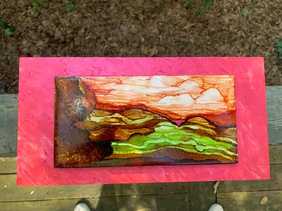 Alcohol Ink painting on tile attached to Acrylic painted 12″ by 6″, 1 3/4′” deep Museum Gesso Board ready to install.