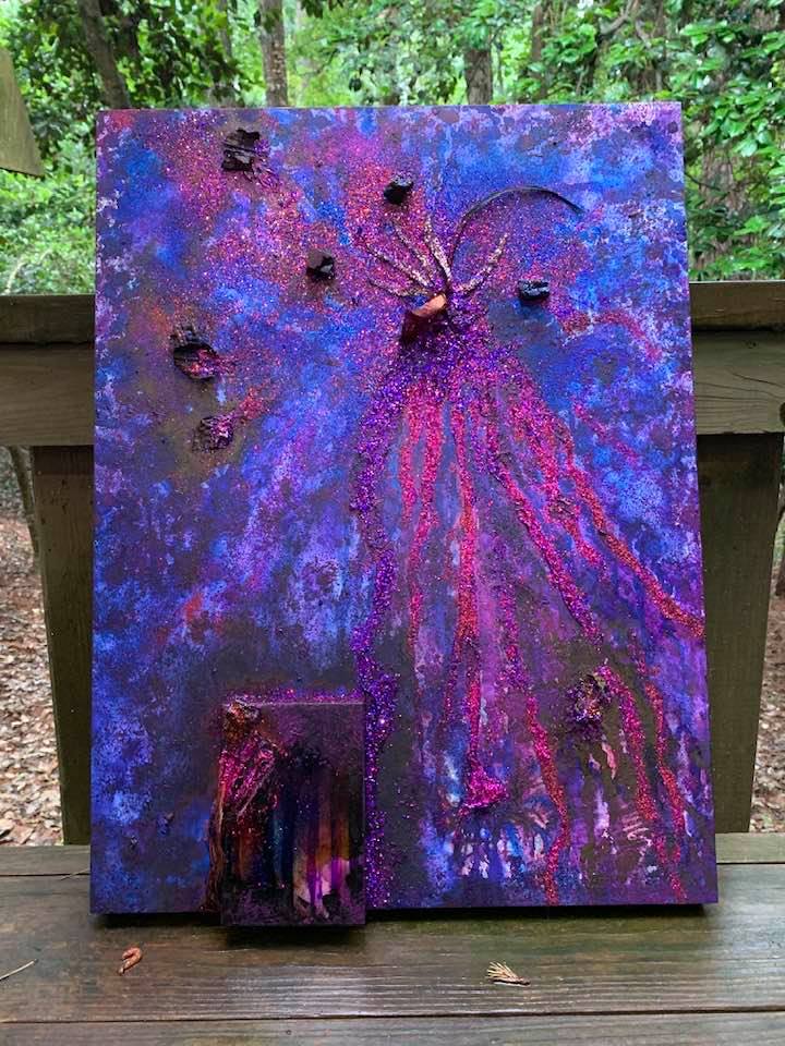Alcohol Ink and Acrylic painting with attached smaller painting, glitter, raw gemstones and found nature finds, 18″ by 24″ on Museum Gesso Board read to install.