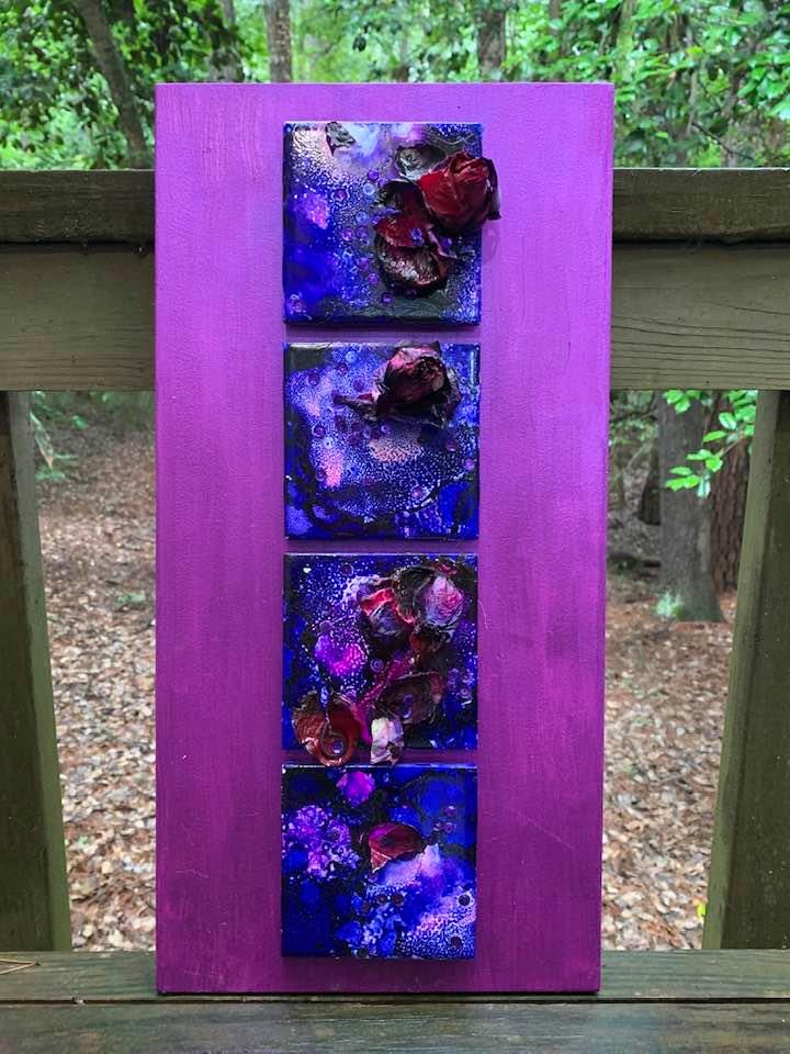 An Acrylic Painting on Textured Gesso Board with attached Alcohol Ink painted tiles with preserved dried roses, sequins, and glitter, 10″ by 20″, ready to install.