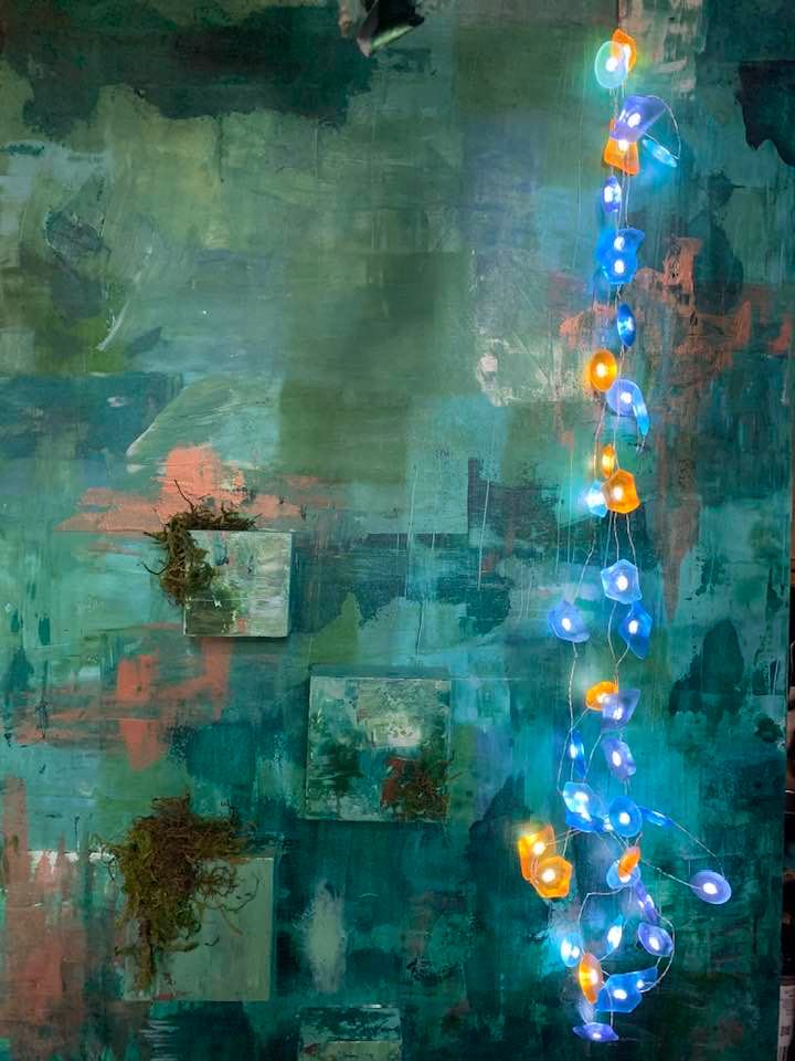 Alcohol Ink painting with gliitter by Texas Artist Kathy L. Murphy in collaboration with Felted Wool with ribbons light by Florida Artist, Mandy Haynes installed to the painting. The light works by remote control and has different settings