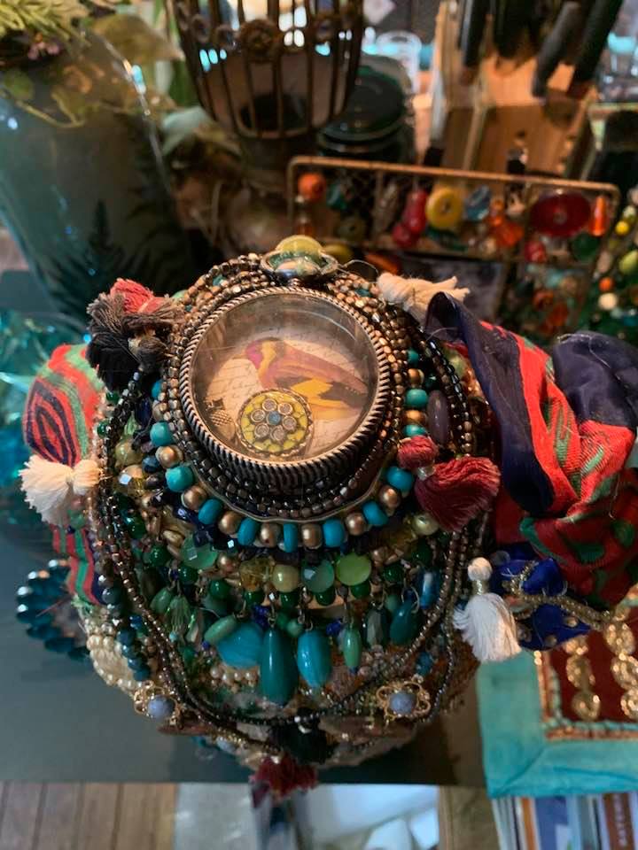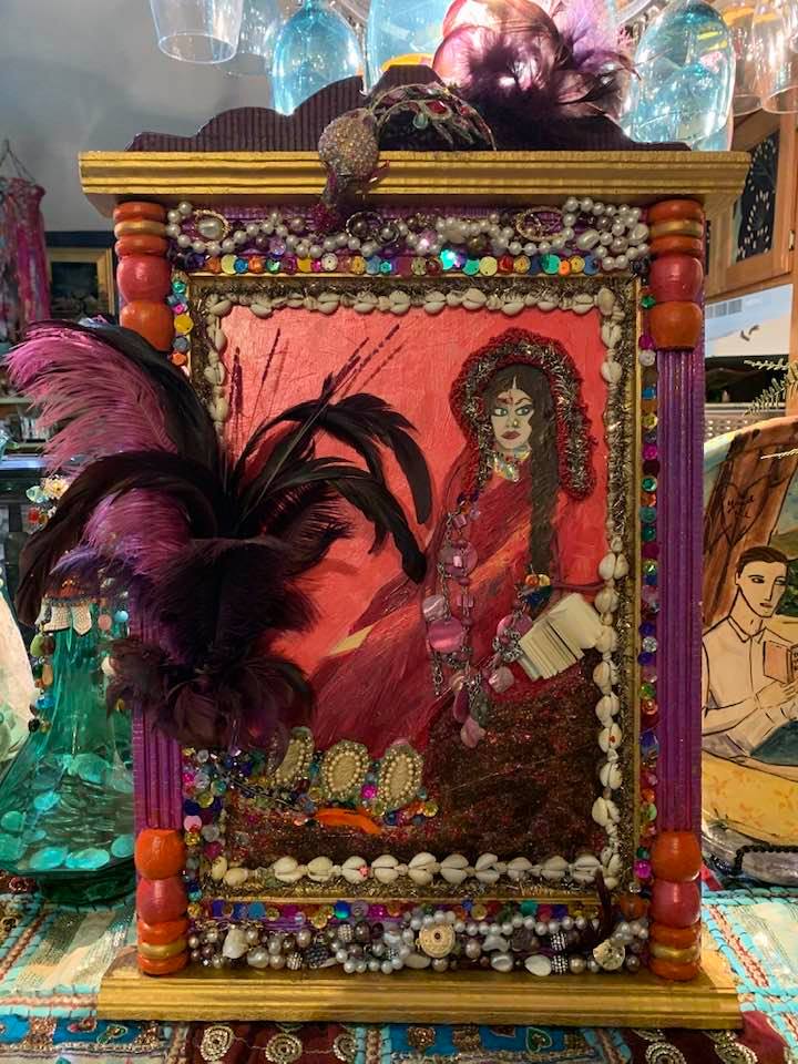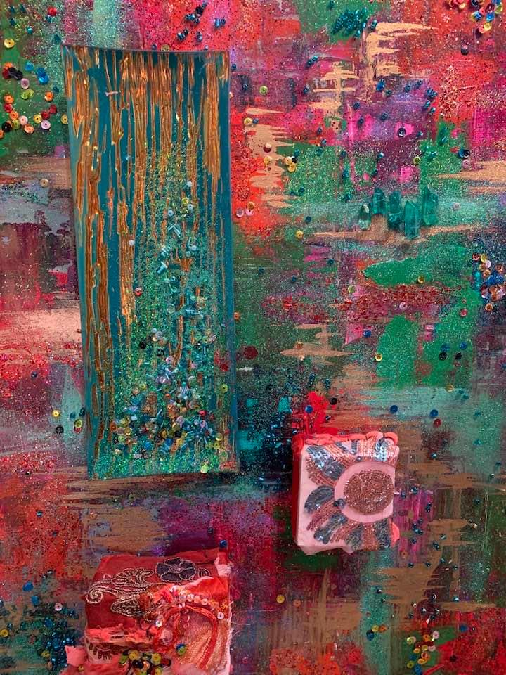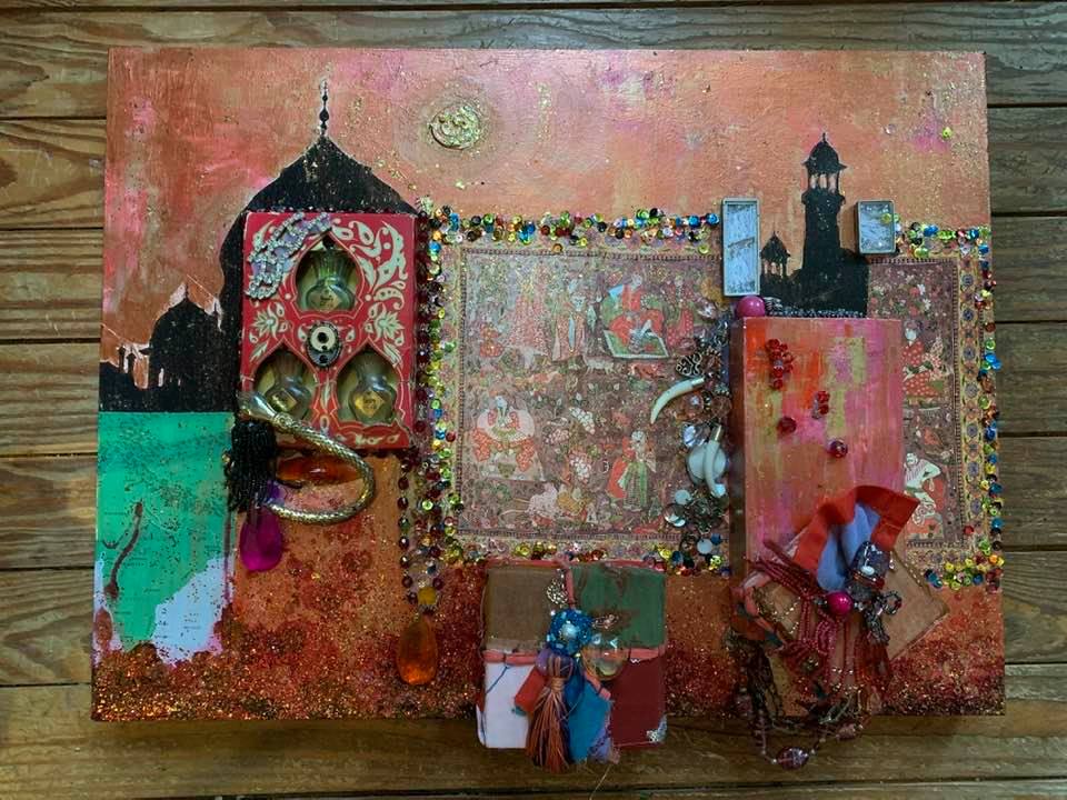 Acrylic & Alcohol Ink painting with another painting and vintage india fabric covered box attached with vintage jewelry, glass beads, sequins, and glitter on 18” by 24” Textured Gesso Board ready to install for purchase.