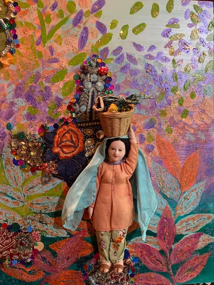 This Acrylic Collage painting is on 18″ by 20: Museum Gesso Board and incorporates a vintage doll from India, vintage beaded sari fabric pieces, hand blown beads, sequins, glitter and is a part of my Bollywood and India theme inspired series of paintings.