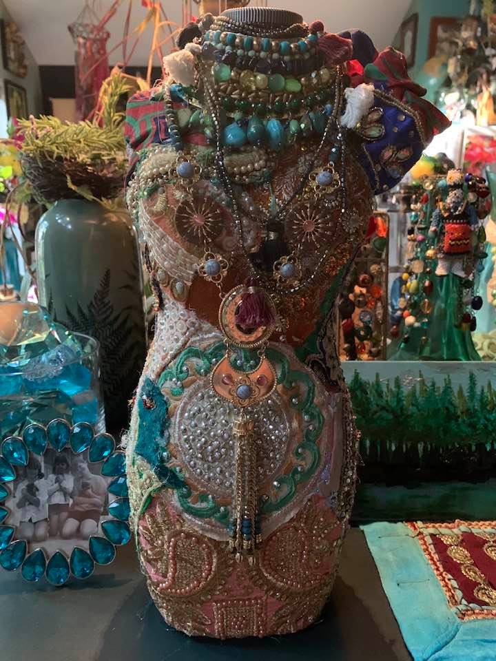 Mixed media collage featuring vintage beaded India sari fabric and vintage jewelry of a woman’s torso.