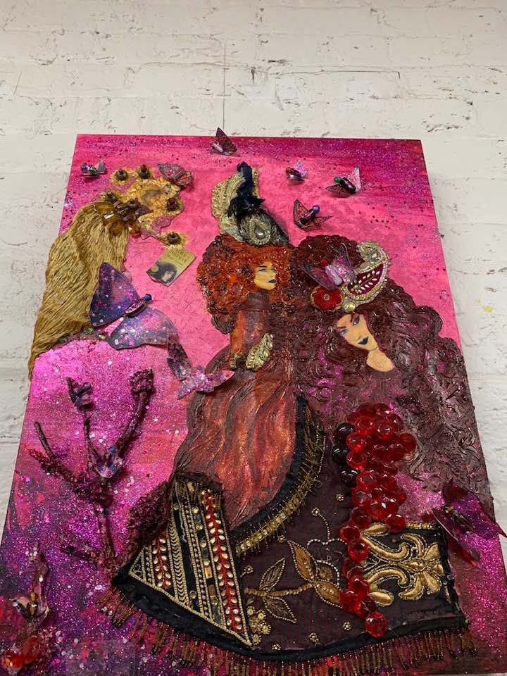 Acrylic/Alcohol Ink and Mixed Media painting on 36″ by 36″ Museum Gesso Board, 2″ deep, with vintage India beaded sari fabrics, vintage jewelry, glass beads, sequins, synthetic hair, and fur.